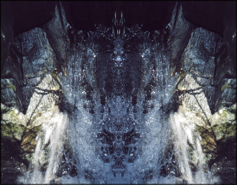 Just recently, my father found the ‘Sourdough Springs’ as they have been named. I was astounded to see where the water came spilling out from this crack in the earth; a few dark rocks, some with a bit of old algae or some sort of green growth, but the musicality of this natural voice, dripping, splashing against the stones, caressing the rock bed as it traveled downward, down the side of the mountain – it spoke to a mysticism that went far past the brief moment of my visit. It seems almost ironic that the picture my dad took of the springs brings up this image that speaks to what I felt back then. This image was book-matched: the left side was reproduced symmetrically and flipped to the right, so one sees a mirror image that stares back at you. I saw the spirit for it when I looked at it at first, but others have suggested comments of a wolf’s head, a crystal wine glass, and a woman giving birth. I’m certain that even you will have your own interpretation of this multilayered picture.
